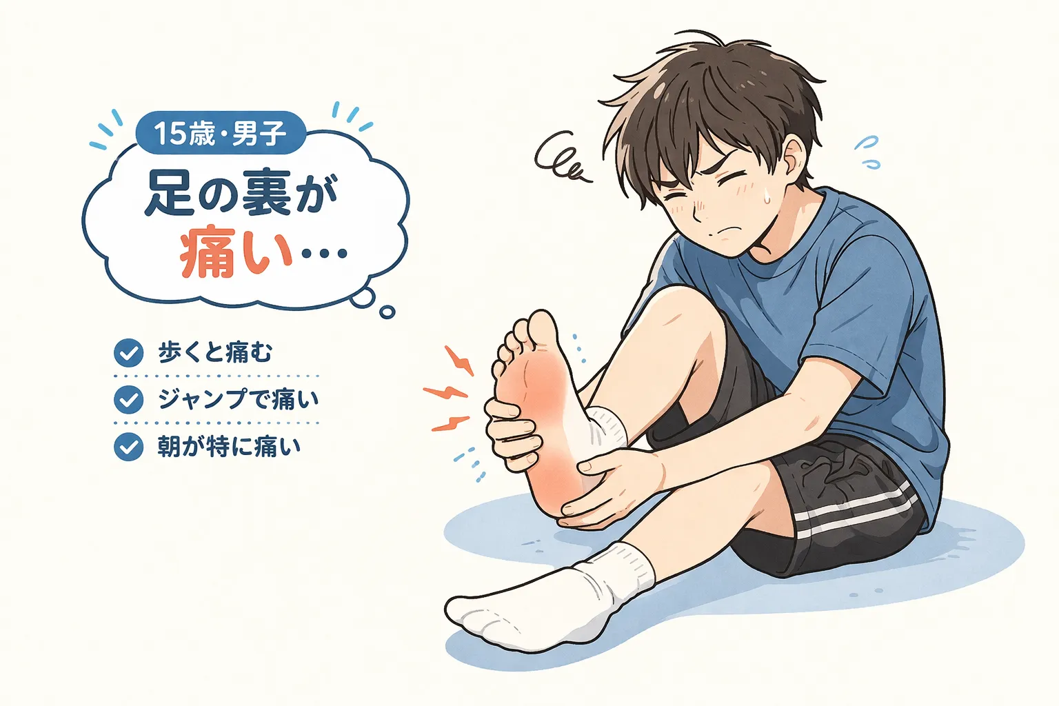 14歳の男子中学生が、部活動中の踏み込み時に足の裏が痛むとのことで来院。特にダッシュやジャンプ時に痛みが出ていました。触診では足裏だけでなく、ふくらはぎの筋緊張が強く、足底への負担が大きい状態が確認されました。